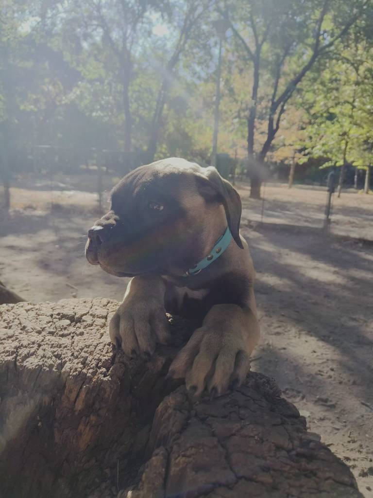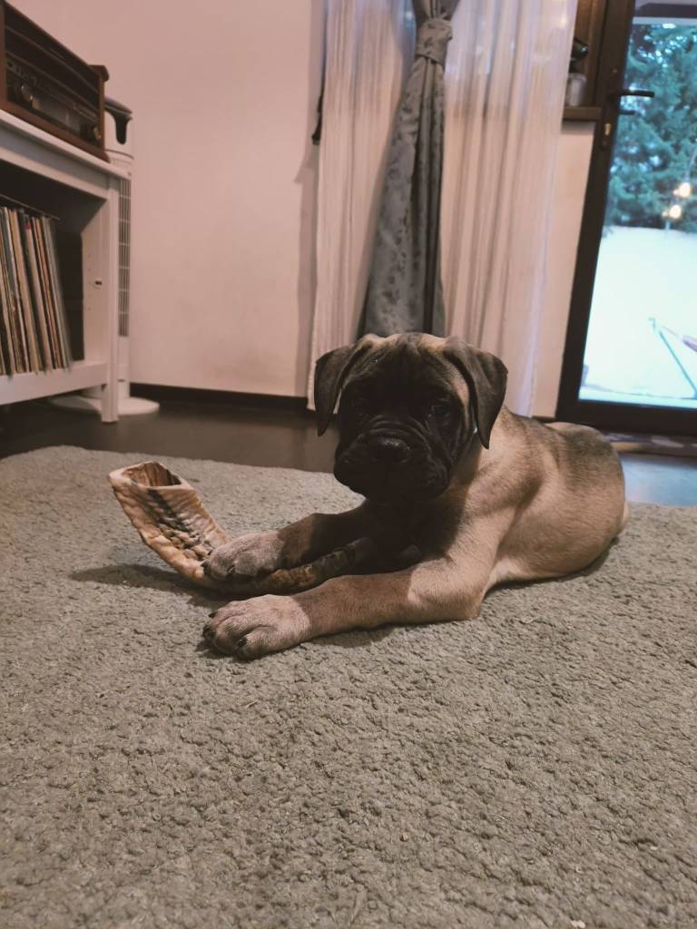 Asa ca la finalul lui 2022 am mers sa vizitam canisa, sa discutam cu dansul despre Bullmastiff ca rasa, sa ne zica pro’s and con’s, sa il descoasem legat de viitoarele cuiburi si sa ne cunoastem ca oameni. Ne-a placut foarte mult si am avut chimie, iar cainii lui erau incredibili atat in fenotip cat si in temperament. Ne-a picat cu tronc o catea pe care urma sa o monteze in 2023, care era brindle (avem un soft spot si noi ca suntem oameni la aceasta culoare) si avea un temperament exceptional (this will be important later in the story). A fost de altfel prima data cand am interactionat fizic cu rasa, deci un imprint in mintea mea/noastra!
