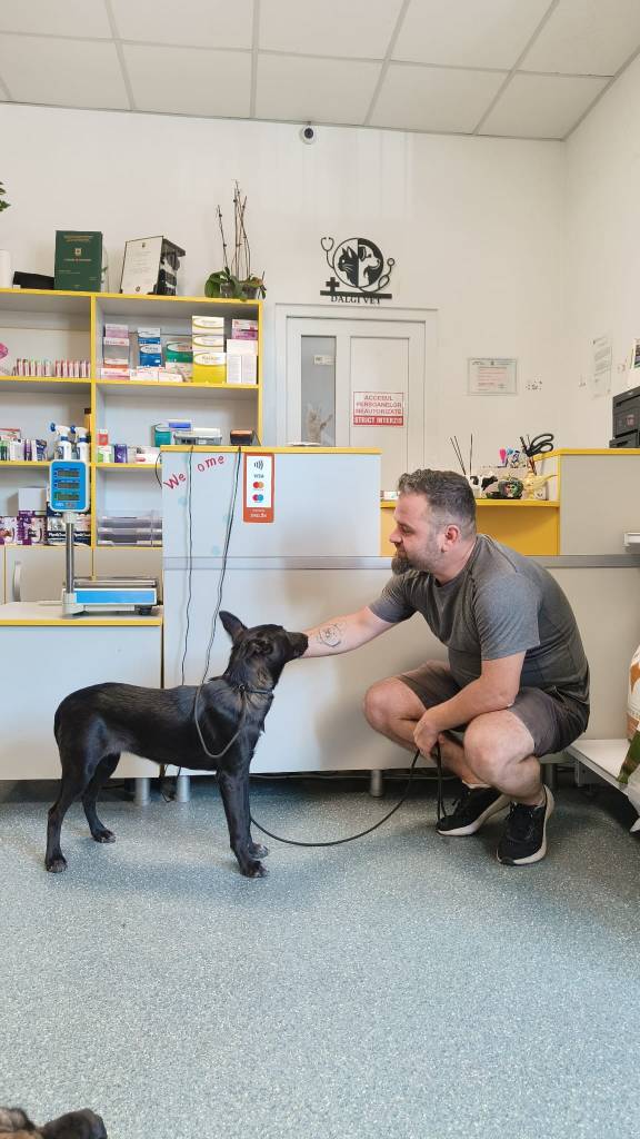 Am adunat toate rezervele de calm pe care am putut sa le adun pentru a da un mesaj Ralucai sa o intreb ce Dumnezeu se intamplase ca baietii care erau gata de adoptat nu erau acolo si Uriasul care nici nu era cel mai adoptabil caine (din nou, prin prisma marimii si culorii – este stiut faptul ca cei cu blana neagra sunt mai rar adoptati) si nici nu facusem mare lucru cu el, deci nu era deloc pregatit pentru asta, era in cusca in fata mea. Mi s-a rupt putin inima de compasiune pentru el, caci saracul abia pusesem cateva caramizi la incredere in oameni (iesisem de 2-3 ori cu el din padoc si construisem putina relatie) si apare o experienta din asta… Imi venea efectiv sa plang de nervi. M-am abtinut insa cat de mult am putut si pana am lamurit situatia am stat langa el si doar am transmis, atat in cat am putut in circumstantele date, o energie calma si increzatoare, reassuring pe cat posibil. Am incercat sa-i transmit calm si ca sunt acolo langa el, chiar daca nu il pot ajuta cu nimic mai mult.