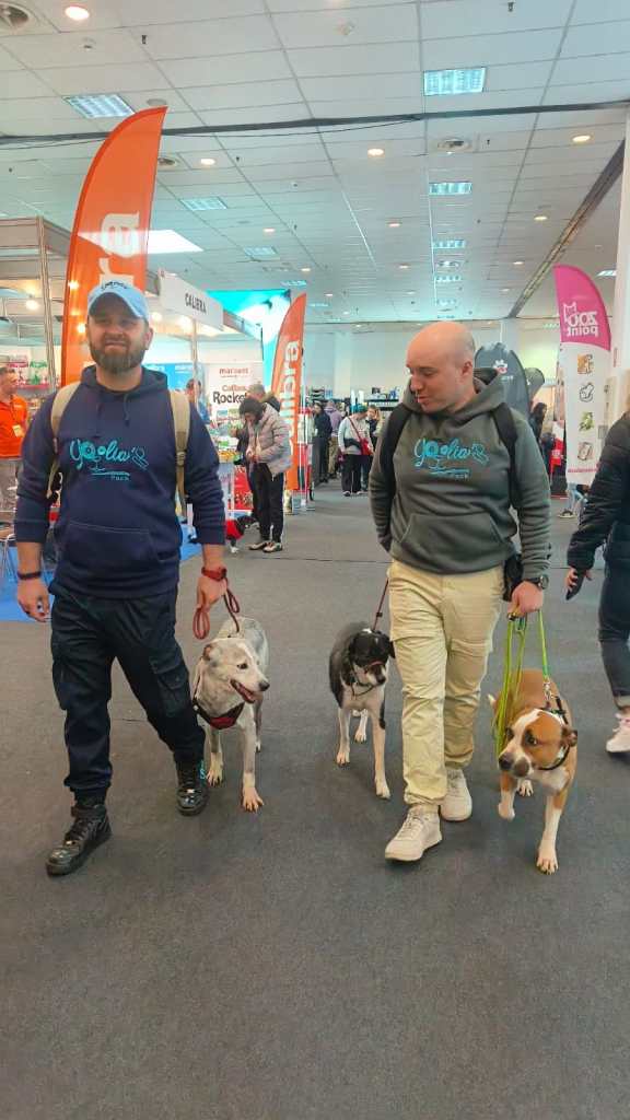 Nu mai spun ca indata ce ne-au mirosit si si-au dat seama ca suntem noi, au inviat si au inceput sa dea cu labuta in cusca sa iasa sa mergem sa ne plimbam, ba chiar Uriasul incepuse sa latre sa ne cheme. Bineinteles ca am dat un tur rapid (caci nu apucasem cu o zi inainte, the downsides of being involved in the event is that you don’t get to enjoy it) si ne-am intors sa ii scoatem si pe ei. Am iesit intai afara la nevoi, apoi am dat din nou un tur al Pet Expo, dar de data asta cu ei, sa ii ghidam si ajutam sa asocieze totul cu cat de mult calm se poate in situatia data (si apropo, Uriasul nu a pus decat o singura frana minora la intrarea in locatie, apoi cu putin ghidaj din lesa a facut pasul si aia a fost; nu as fi reusit acelasi lucru pe un ham). Ei bine, nu va imaginati cat de mandri am fost de modul in care s-au comportat baietii nostri! Au fost efectiv incredibili, calmi printre toti cainii si oamenii agitati de acolo, conectati cu noi, motivati de mancare in high stress & high distractions, au stat la poze si mangaieri de catre random people de pe acolo… All in all absolutely amazing! Ne-au crescut inimile!