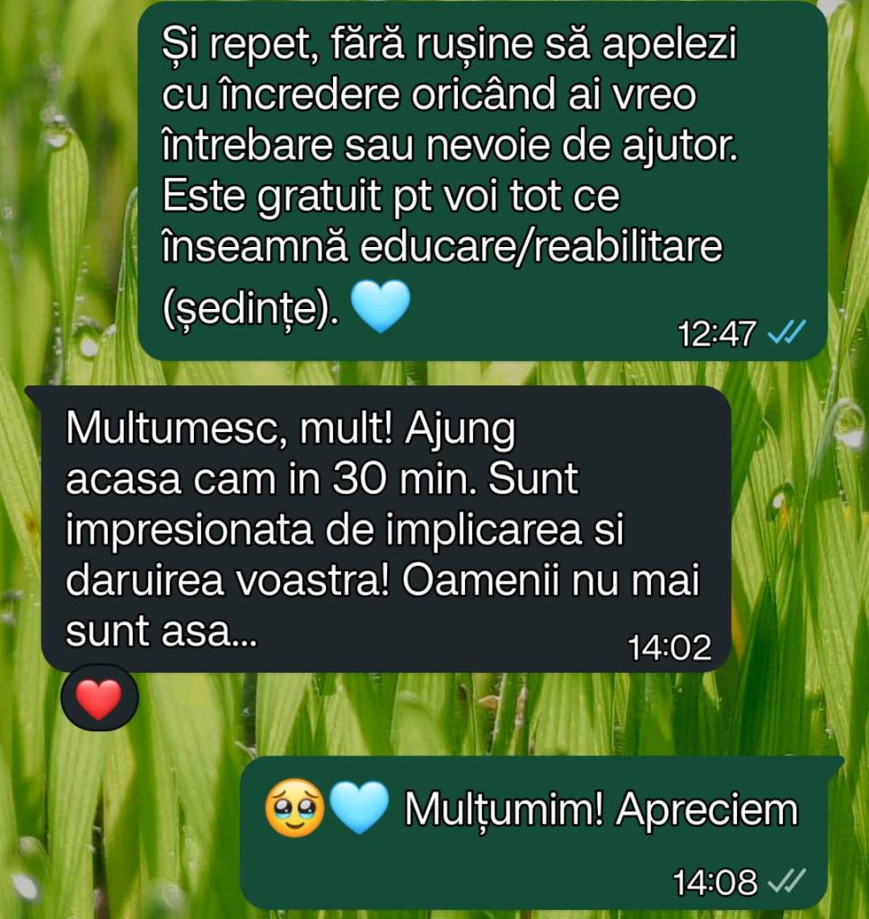 Apropo, am decis ca si echipa, ca acelor caini cu care noi lucram de la Odai respectiv Dalgi, sa le oferim chiar si dupa adoptie, consultanta gratuita stapanilor in procesul de acomodare. Avem contactele tuturor celor care au adoptat acesti caini si a doua zi dupa adoptie toti au primit mesaje in care le reaminteam ca le stam la dispozitie pentru orice, fara costuri suplimentare! Din pacate (sau fericire) desi au luat la cunostinta (ne-au multumit toti), in afara de familia Frumuselului, restul nu ne-au contactat inca. Zic din pacate pentru ca sunt sigura ca le-ar fi de folos, insa consider ca daca nu au facut-o (si cainii nu au fost returnati) probabil nu sunt probleme si adoptiile raman viabile pe termen lung si foarte lung.