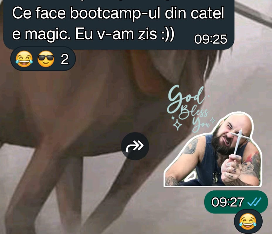 Raspunsul a venit destul de evaziv, spunand ca ne-a intrebat daca noi ne ocupam de dresaj de concursuri (which she did in fact) si noi am zis nu (which again we did) si ca au lucrat o vreme cu dresorul mentinat de noi si apoi s-au dus la un club de dresaj sa lucreze mai intens pe o anumita directie. Iar cu omul mentionat mai sus au colaborat pentru cazare doar. Si fara nicio remuscare (la modul, mi-a prins bine grupul, mersi de info, mi-ar placea sa raman etc) a zis sec „sigur, pot iesi de pe grup fara probleme”. Deci din perspectiva ei, nu lua nicio valoare de acolo (si este de inteles, caci femeia nu era niciodata activa in invatare acolo).