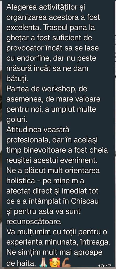 La acel moment insa, tot in Octombrie 2023, am avut o situatie de cotitura in grupul de clienti si s-a cerut o curatenie generala si o purificare a vibe-ului grupului. Am scos din grup o masa de oameni, care fie nu respectau regulile grupului, erau mereu in opozitie, nu parea sa le placa sa faca parte din grup sau sa ne fie alaturi in diversele evenimente, sau pe la fata erau haha hihi, iar pe la spate ne muscau de posterior, in cadrul plimbarilor regionale. Drept urmare, am eliminat din grup pe toata lumea care fie nu respectase regulamentul (una dintre reguli fiind ca macar odata la 6 luni sa vii intr-un eveniment de grup, fie ca este unul oficial organizat de noi, sau unul regional si drept urmare GRATUIT), fie erau in opozitie cu valorile noastre organizationale si ceea ce voiam sa cladim.